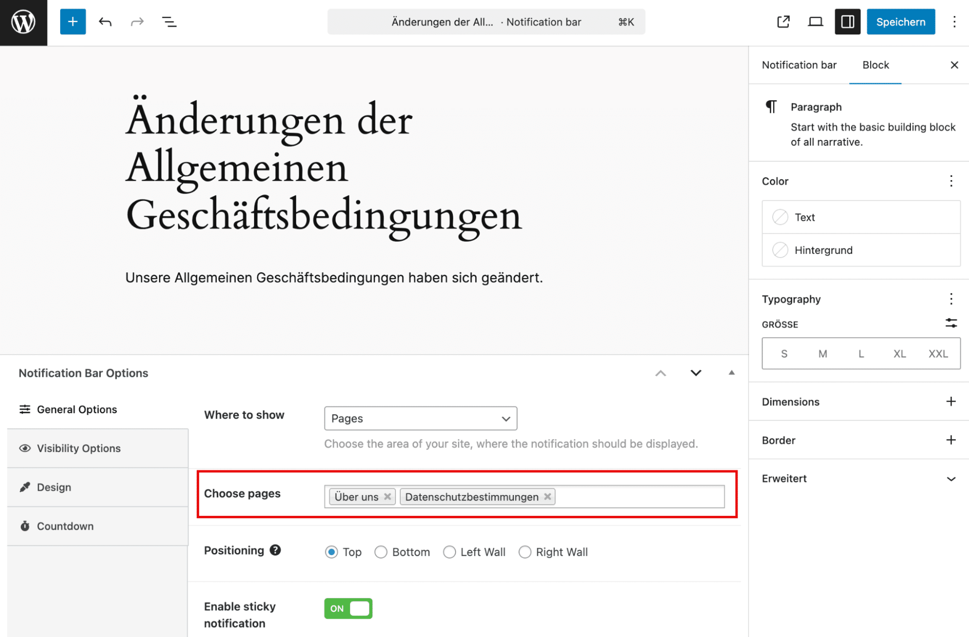 In Notification Bar Options, choose “Where to show”, and then choose specific content. In our example, we’re editing the German notification bar, so we only see pages that have been translated in German.