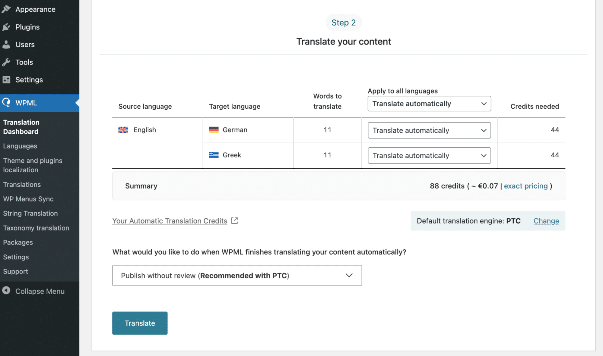 The Translation Dashboard shows you how much it’ll cost to translate your content. PTC comes with a quality guarantee, so you can get a refund for this amount if you’re not satisfied.