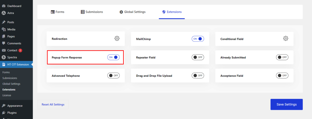 To enable the “Popup Form Response” extension, first, visit the “HT CF7 Extension” menu from your WordPress dashboard.