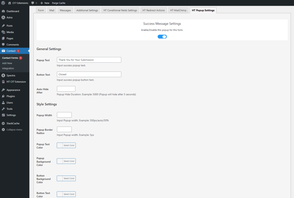 After you enable the settings for success or error popup message, some necessary options will appear. You can leverage these options to configure the settings for the popup messages.