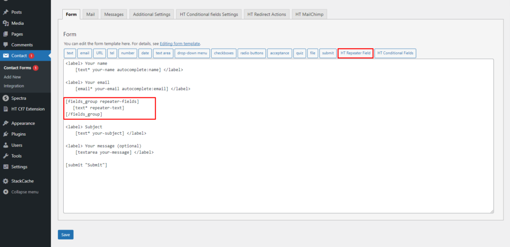 To enable the “Repeater Field” extension, go to “HT CF7 Menu” from your WordPress dashboard and open the “Extensions” tab. Then turn on the switcher option for the “Repeater Field” extension and save the settings.