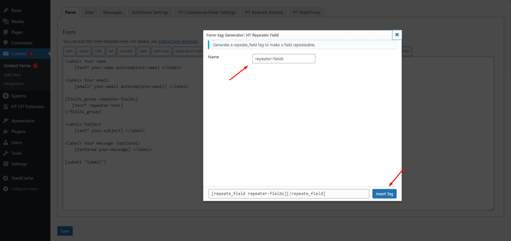 Like other extensions, enabling the “Repeater Field” extension will add a new tag named “HT Repeater Field” on the form edit screen. You can see the tag when you try to edit an existing form or create a new one. If you click the tag, a popup will appear prompting you to configure the field by setting up a name of it.