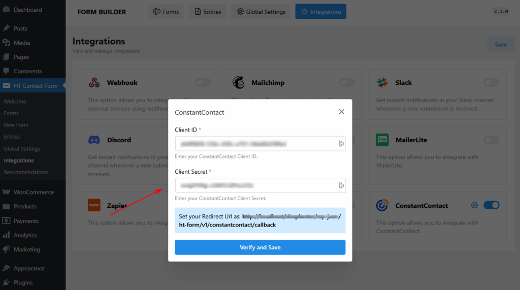 - Paste your Client ID and Client Secret into the popup fields in HT Contact Form.