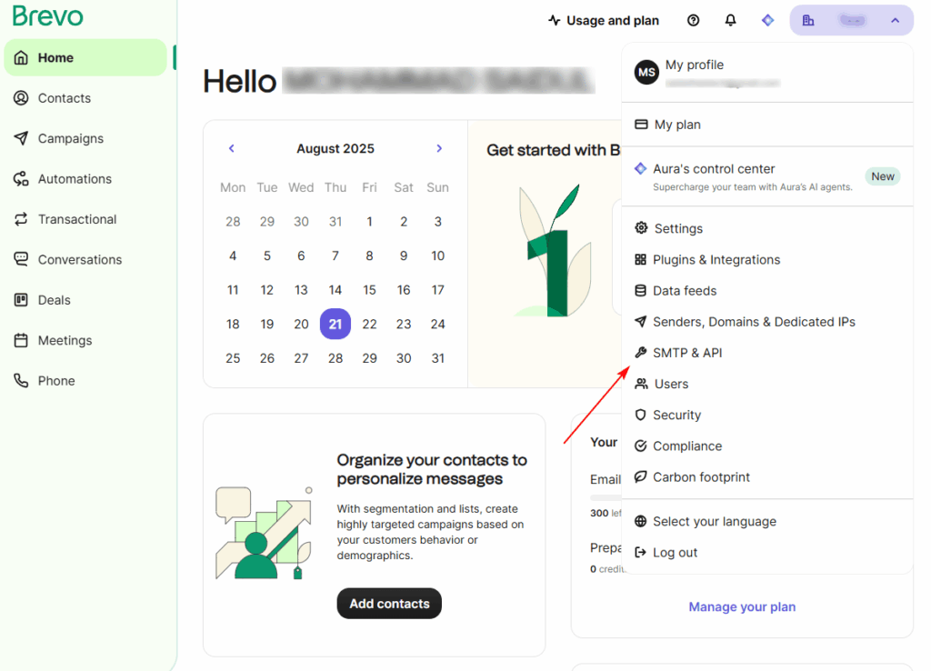 - Click your profile icon (top right) → choose SMTP & API.