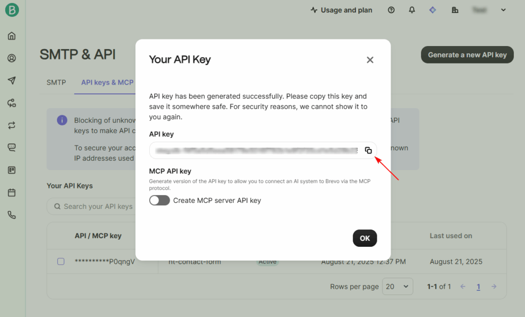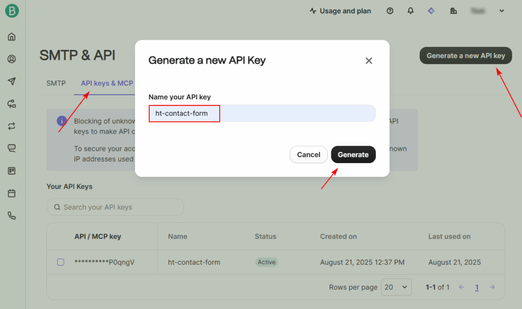 To connect Brevo with HT Contact Form, you’ll need an API key:
