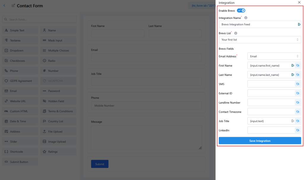 Brevo (formerly Sendinblue) is a popular email marketing and CRM platform. With HT Contact Form, you can seamlessly connect your form submissions to Brevo and automatically add new contacts to your selected Brevo list.