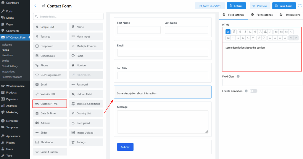 - From the Fields panel on the left, drag and drop the Custom HTML field into your form.
