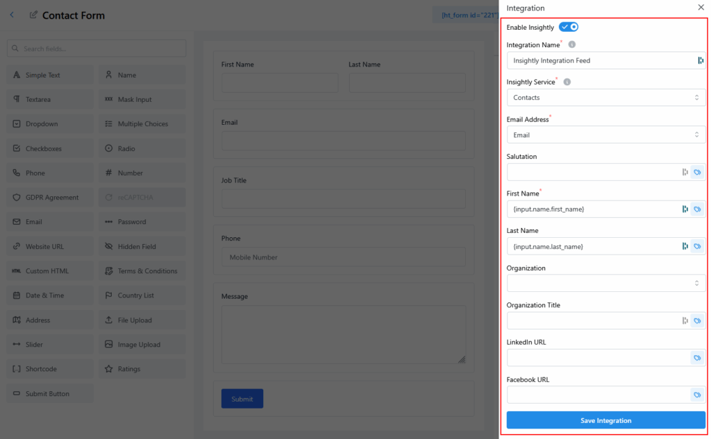 - Map form input fields (Name, Email, etc.) to corresponding Insightly fields.