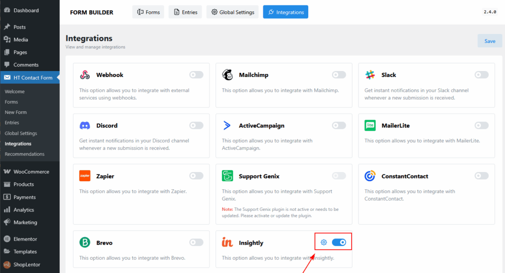 - Navigate to: HT Contact Form → Global Settings → Integrations