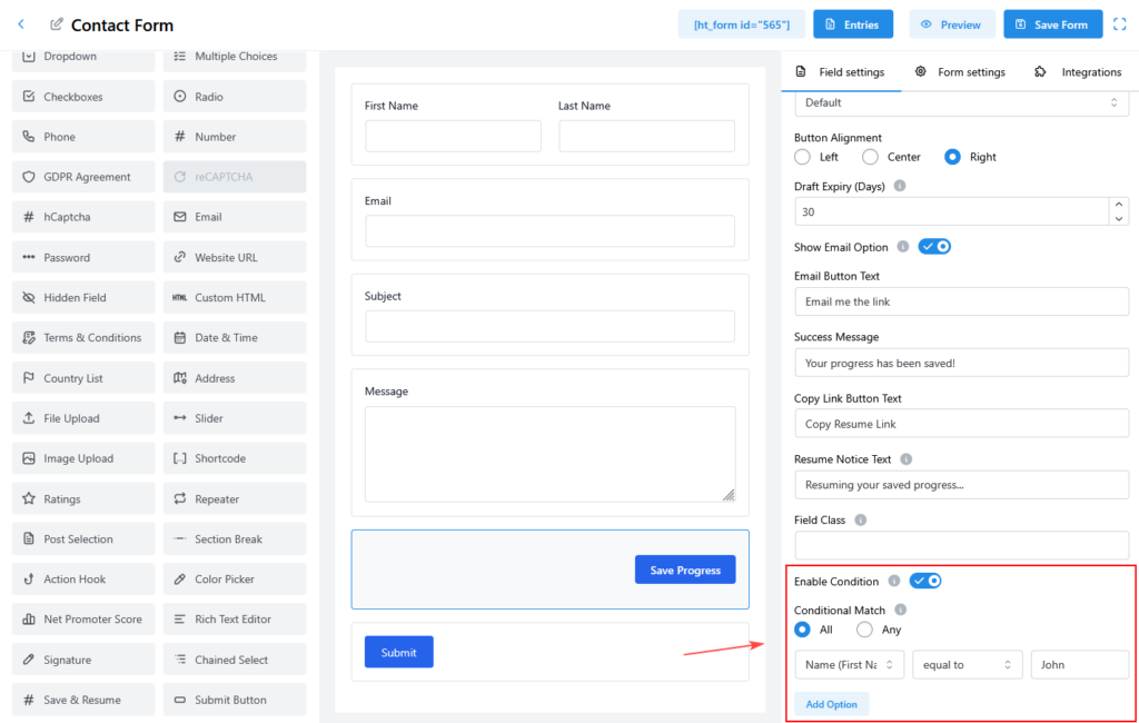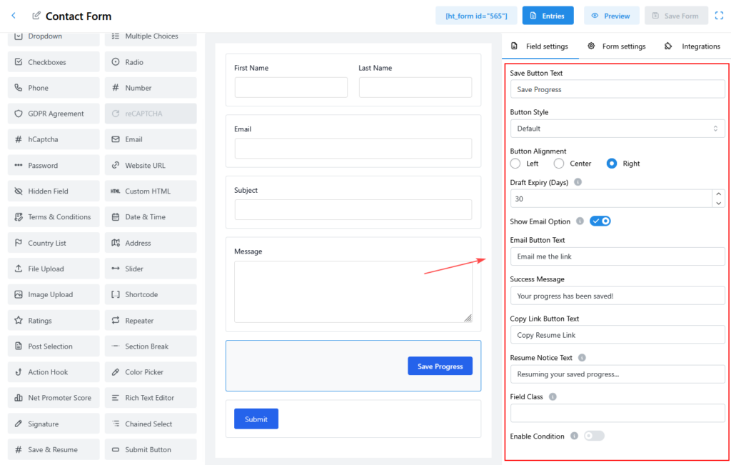 The Save & Resume Field allows users to save their form progress and continue later using a secure resume link. This feature is ideal for long or complex forms where users may need additional time to complete all fields.