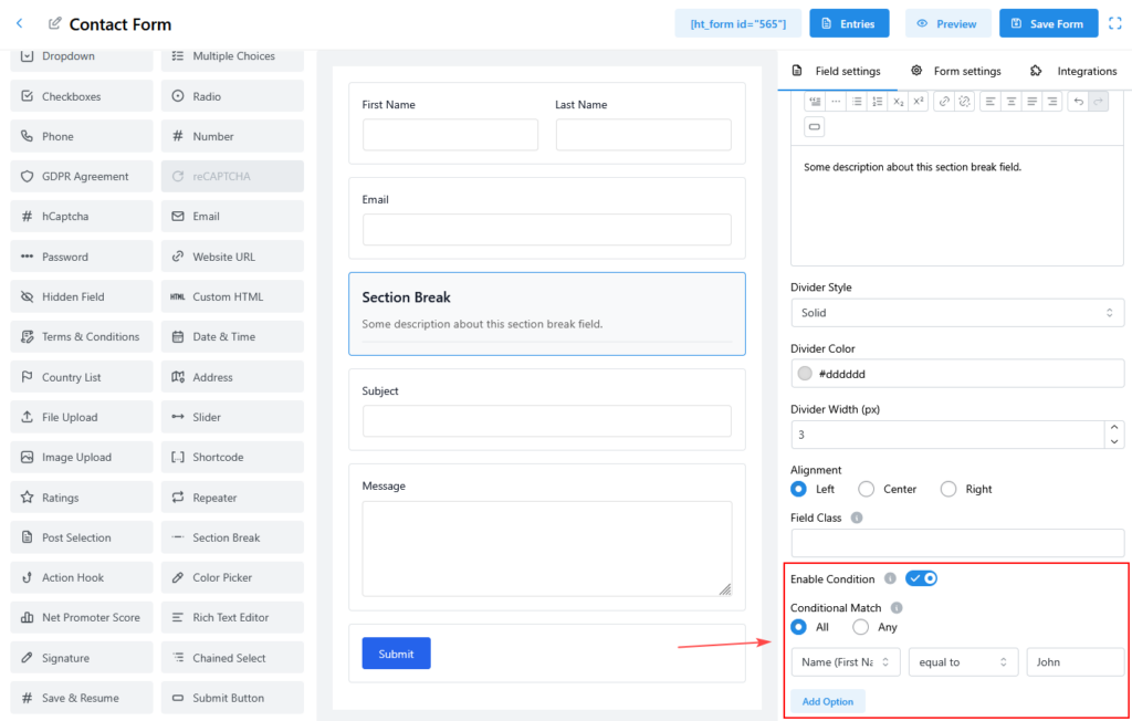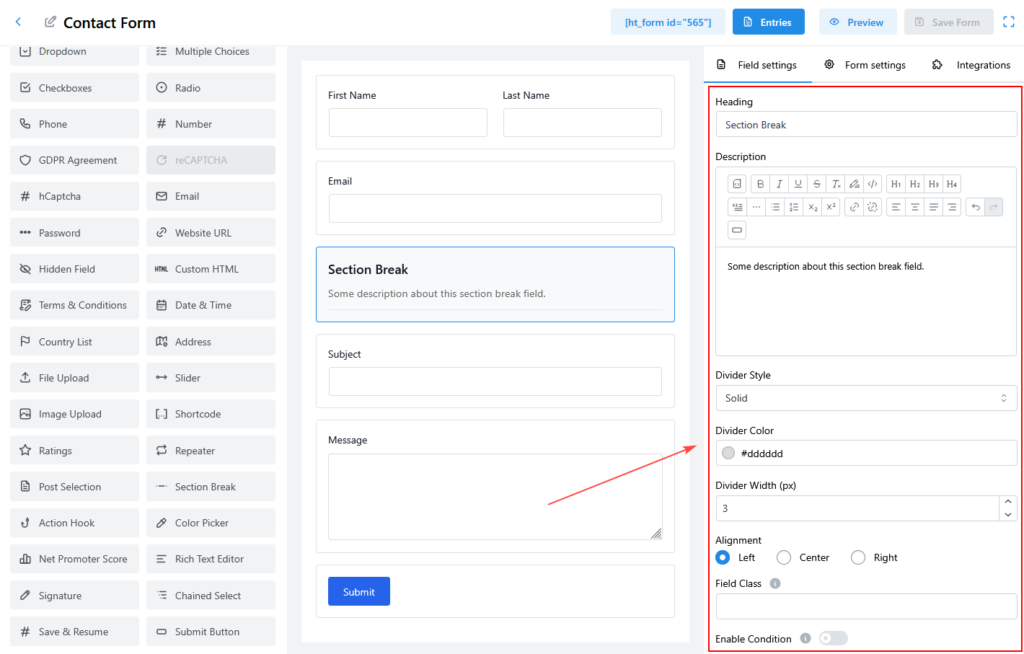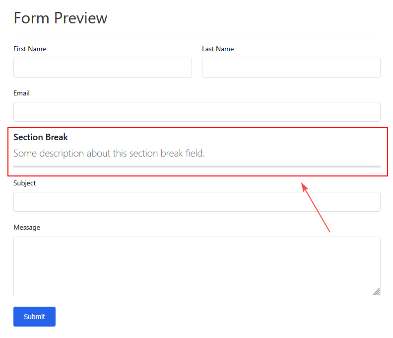 The Section Break Field helps you organize long or complex forms by visually separating fields into clear sections. It allows you to add a heading, description, and divider line to improve form readability and user experience.