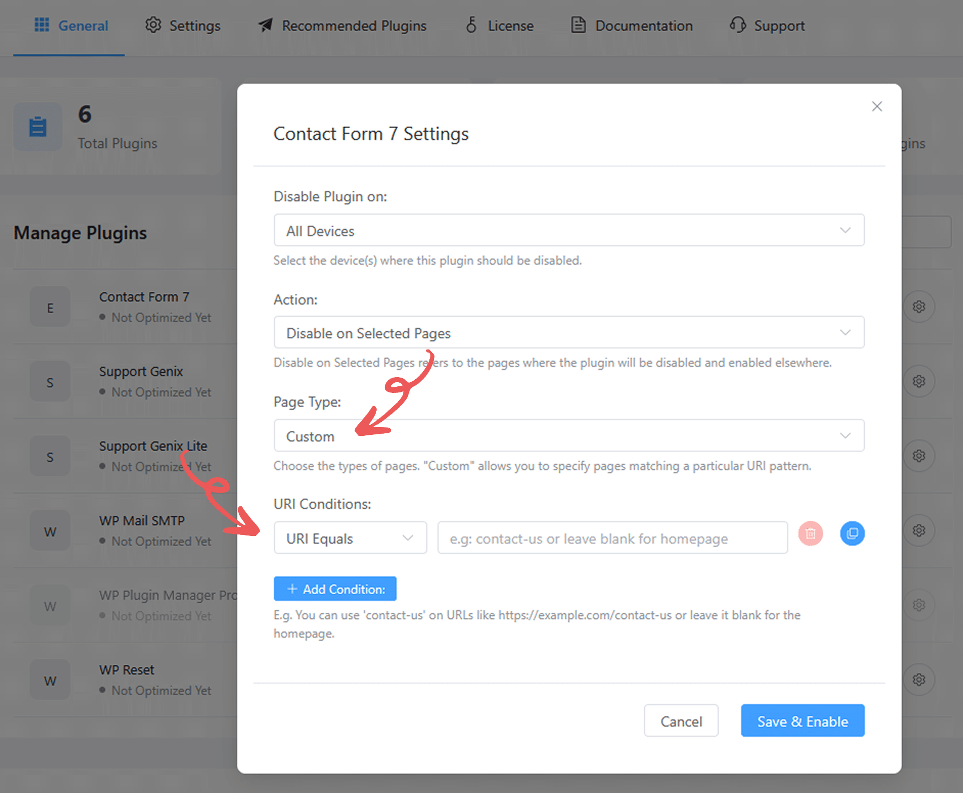 - Under URI Condition Settings, you can define how plugin deactivation should behave based on different URL matching rules.