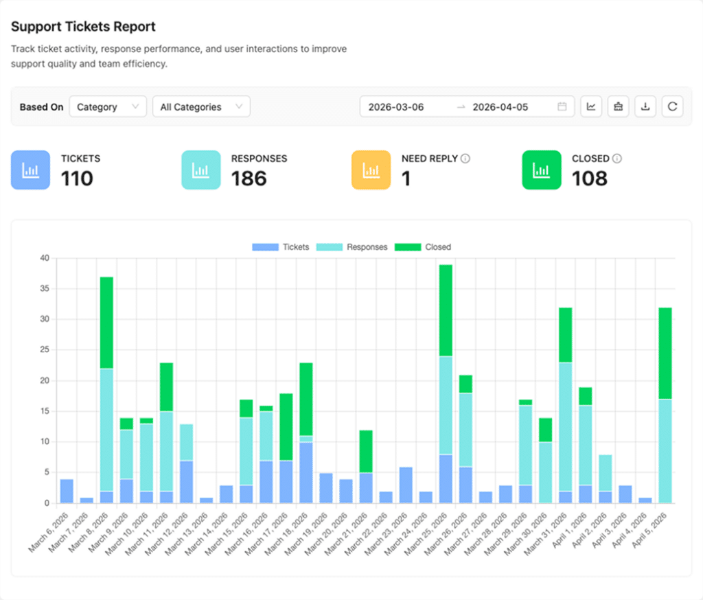 - Smart Filters: Sort tickets by status, priority, category, tag, or assigned agent.